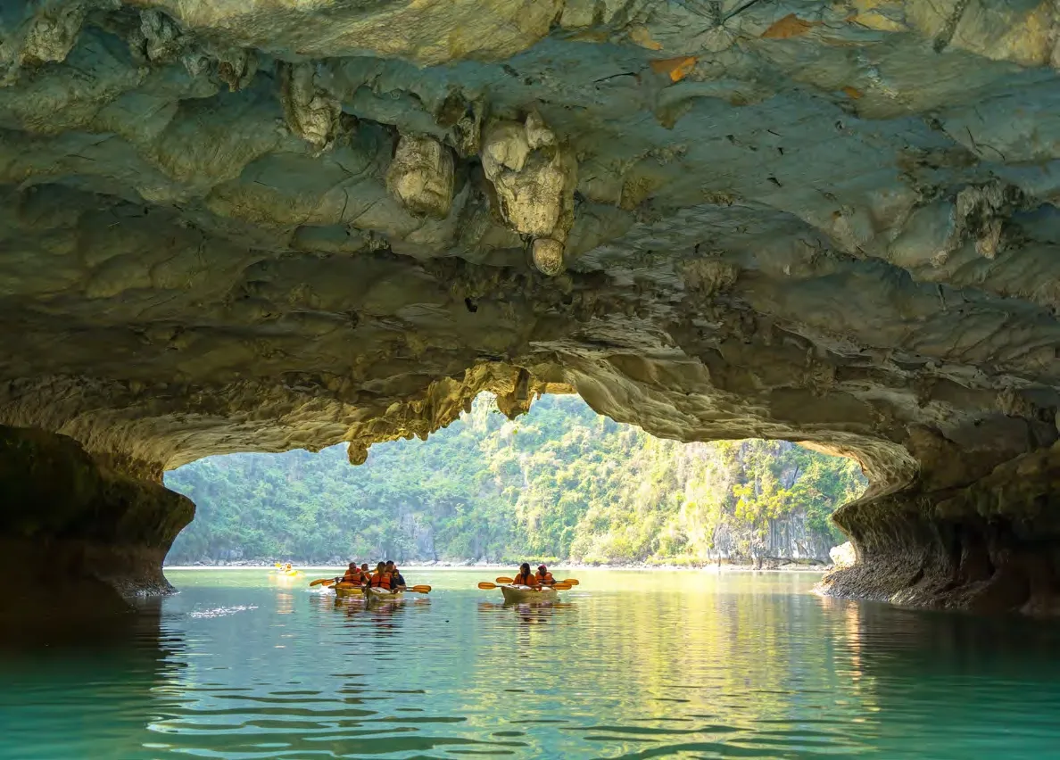 - 14:30–15:15: Explore Luon Cave by kayak or bamboo boat, surrounded by cliffs and lush vegetation.