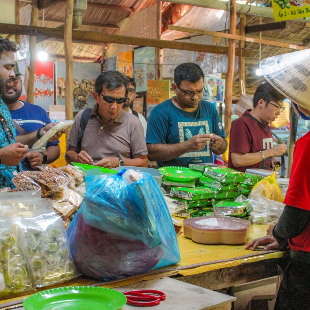 • Visit a coconut candy workshop, sample seasonal tropical fruits, enjoy honey tea, and listen to Southern Vietnamese folk music performed by local residents.